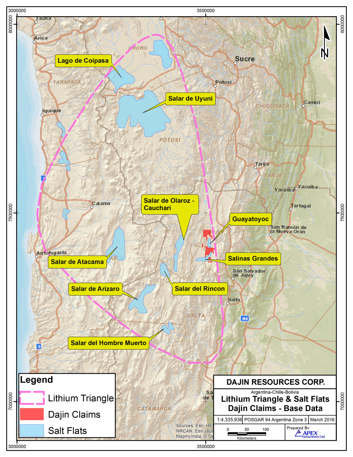 Dajin Resource Corp. (Dajin) holds a 49% working interest in concessions or concession applications in Jujuy province of Argentina covering regions known to or believed to contain brines rich in Lithium, Potassium and Boron. The concessions total approximately 93,000 hectares (230,000 acres) in various drainage basins including 51,970 hectares (128,421 acres) of salar (salt lake) in Salinas Grandes and 41,068 hectares (101,481 acres) in Guayatayoc salt lake basin. salar (salt lake) in Salinas Grandes and 41,068 hectares (101,481 acres) in Guayatayocl salt lake basin. Salinas Grandes/Guayatayoc salt lakes basin was chosen as Dajin’s principal focus for Lithium exploration on the basis of data that are published in various scientific publications, indicating both permissive brine chemistries accompanied by Lithium concentrations in surface and near surface waters that are within the range of Lithium concentrations being produced elsewhere and enabling infrastructure.